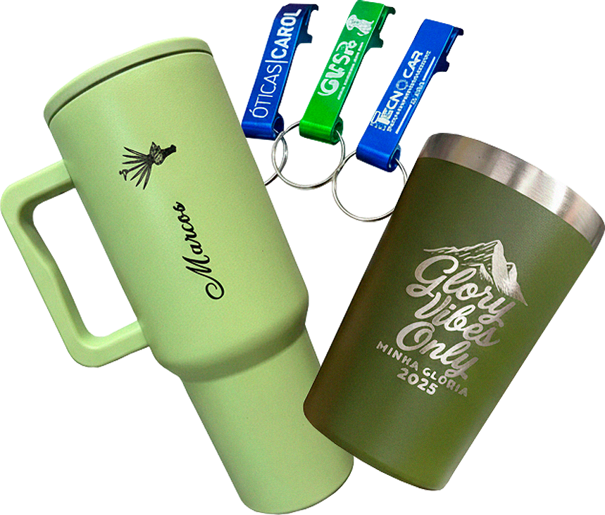 Transforme itens do dia a dia em peças únicas. As gravações a laser nas canecas térmicas e squeezes garantem acabamento preciso, durabilidade e resistência ao calor e à umidade. Ideal para brindes corporativos, eventos ou uso pessoal, unindo estilo e identidade em cada detalhe.